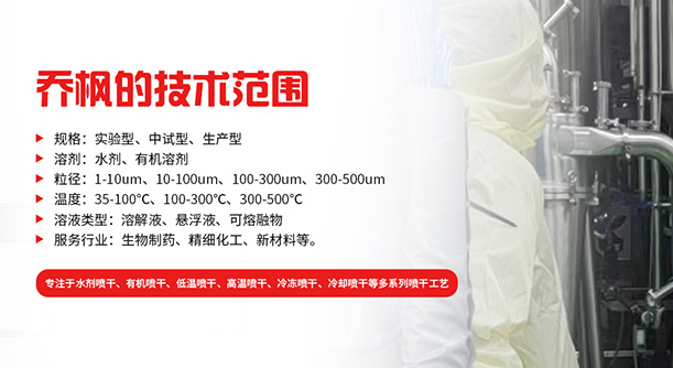 上海喬楓實業有限公司,成立于2012年,是從事噴霧干燥設備的研發設計、生產、銷售(小型噴霧干燥機,實驗型噴霧干燥機,35℃低溫噴霧干燥機有機溶劑噴霧干燥機,低溫閉式循環噴霧干燥機、超細粉末噴霧干燥機、噴霧冷凍干燥機、真空噴霧干燥機氣流噴霧干燥機,噴霧造粒干燥機離心噴霧干燥機沸騰制粒機等)和售后于一體的綜合性公司,本公司現成為一家致力于為生物制藥、精細化工、新能源、陶瓷造粒及食品工程等領域提供全套解決方案的整線交鑰匙工程企業。
